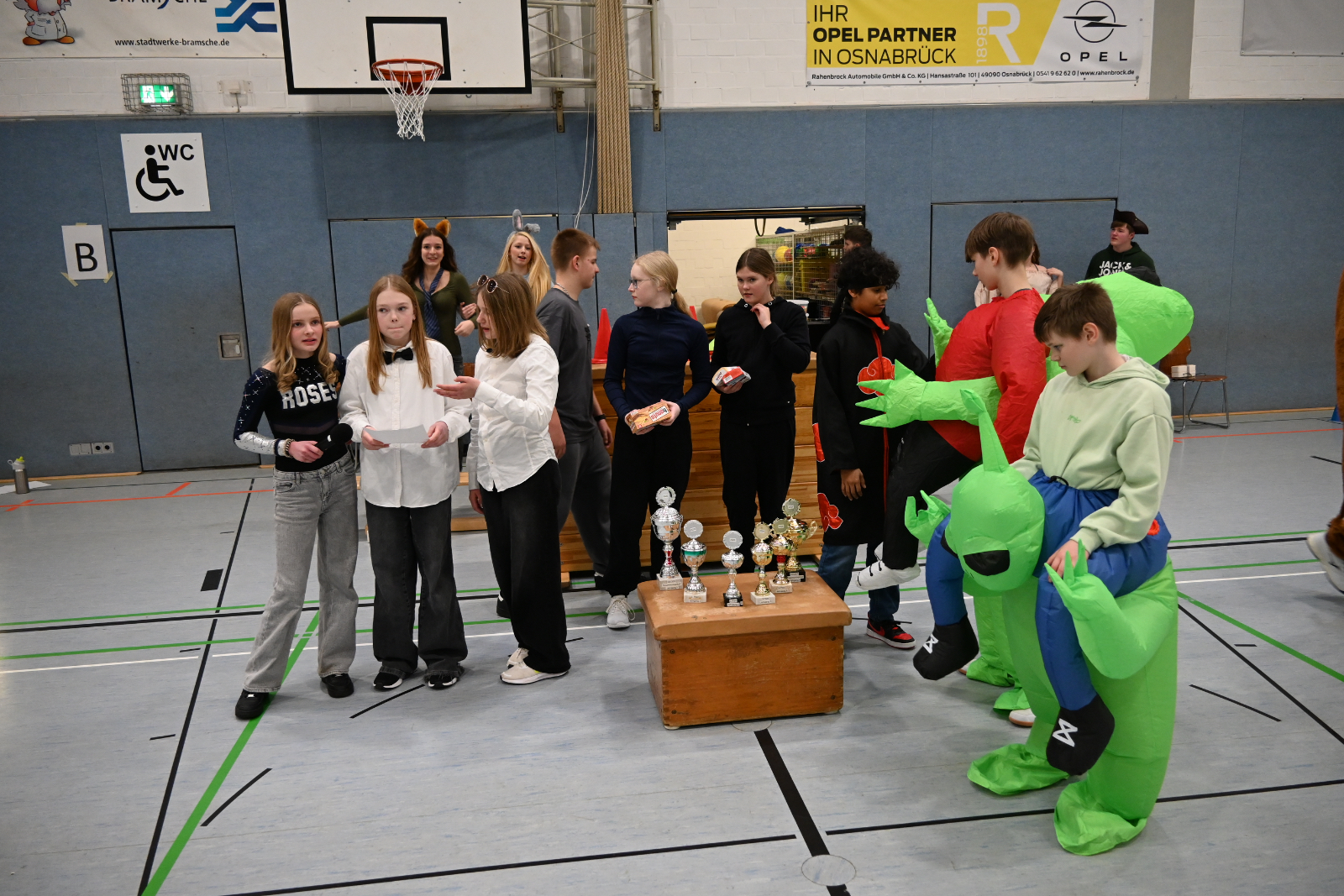 Am Rosenmontag begegneten sich die Schulklassen der Jahrgänge 5 und 6 zum alljährlichen Sportturnier. In diesem Jahr galten die Regeln einer Dodgeball-Variante, die die Juleicies aus Jahrgang 10 entwickelt hatten: „Hühnedodge“. Ein wilder aber spaßiger Vormittag nahm seinen Lauf: Zwischen Krümelmonstern, Minions, Piraten, Affen und anderen...