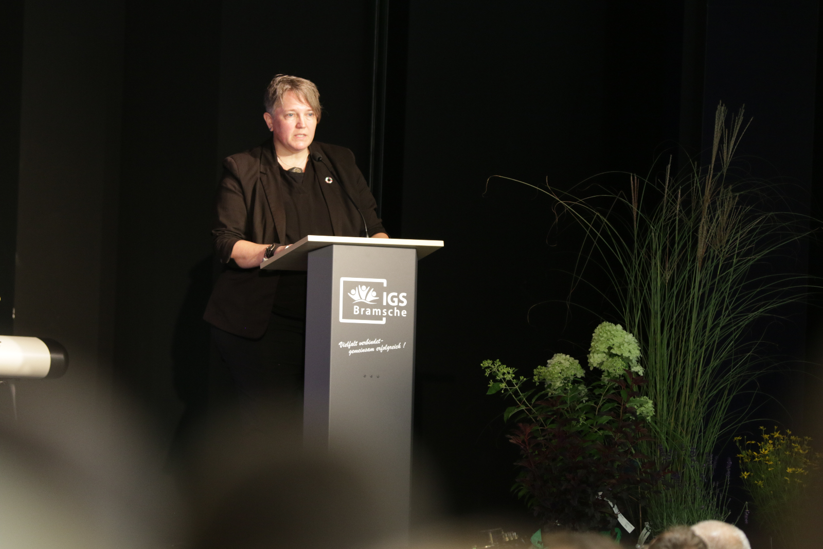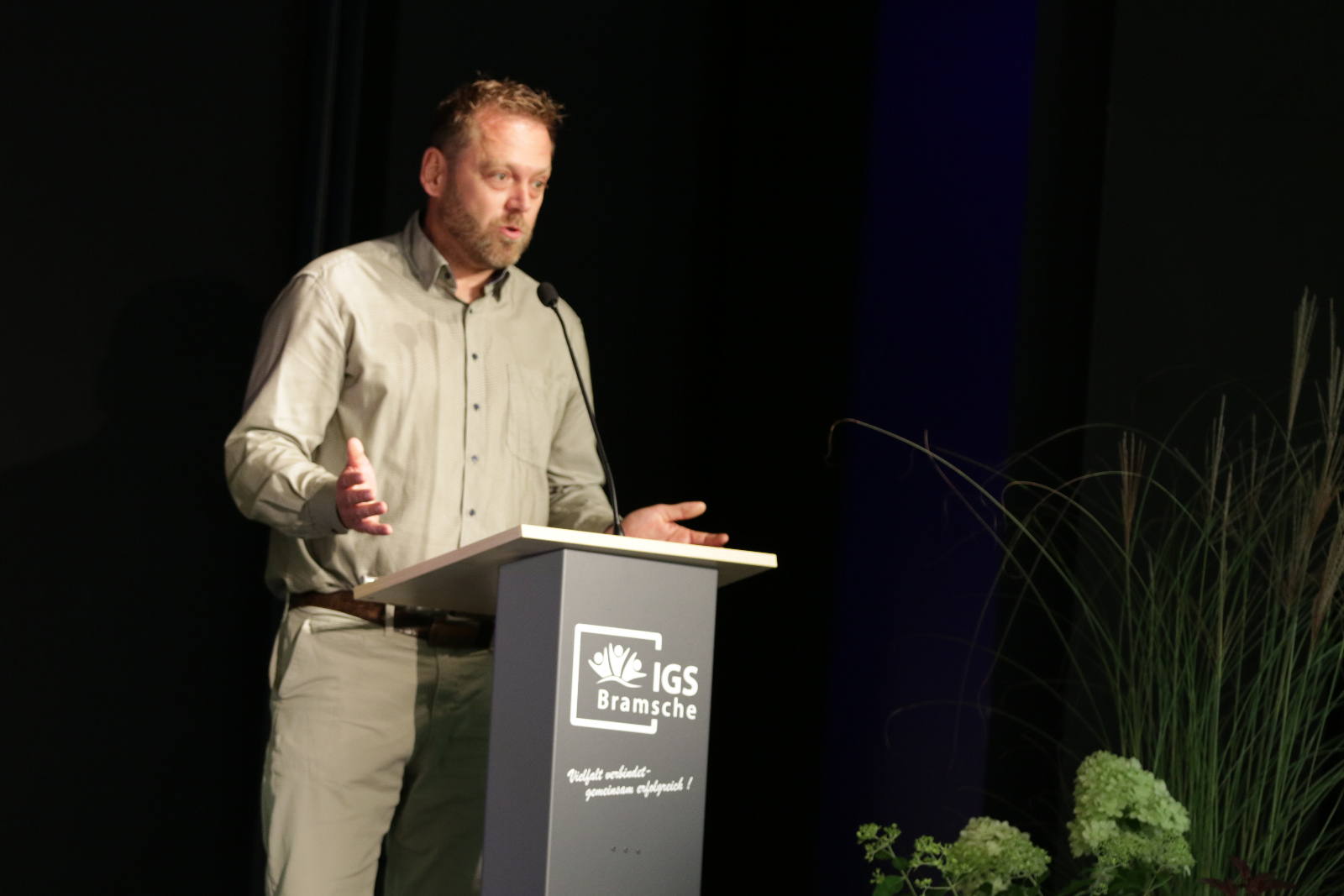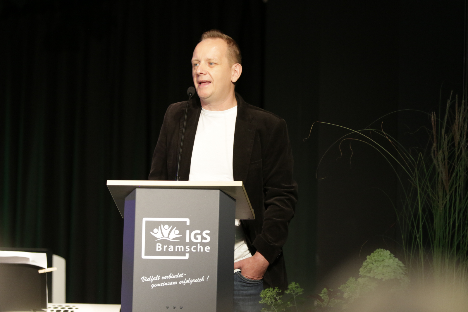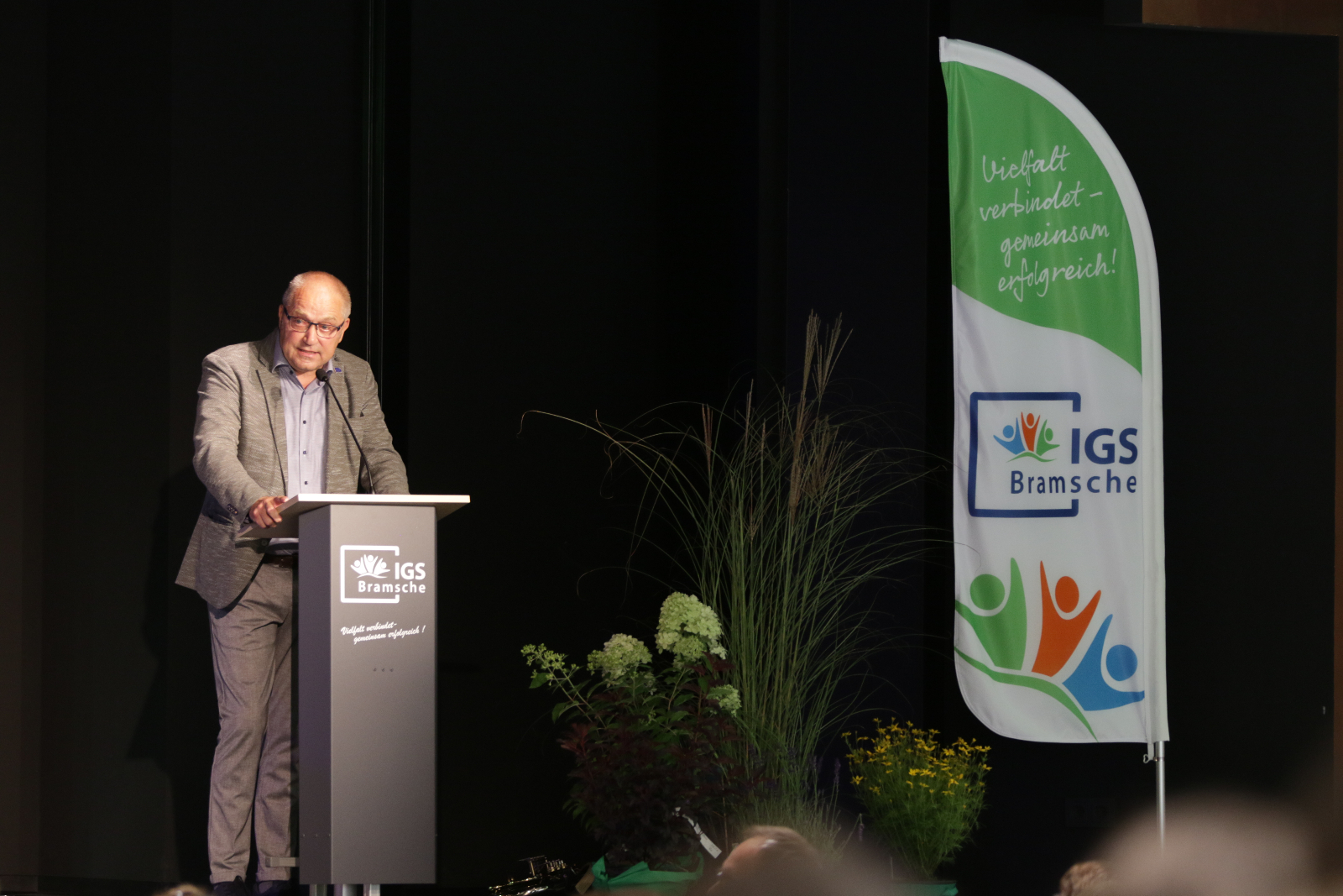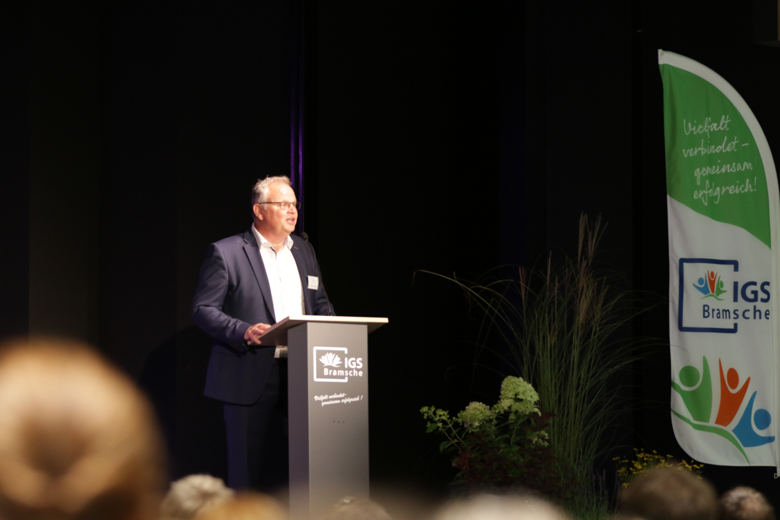 Der offizielle Festakt begann am Vormittag um 10 Uhr im Forum der Schule. Zahlreiche Gäste aus Politik und Gesellschaft, darunter Landrätin Anna Kebschull, Bramsches Bürgermeister Heiner Pahlmann, Vertreter des Regionalen Landesamtes für Schule und Bildung sowie die Politikerinnen Filiz Polat (Grüne) und VertreterInnen von Kreistagsfraktionen, überbrachten ihre Glückwünsche. Kebschull betonte in ihrer Rede: „Der Landkreis ist stolz, die IGS Bramsche als innovative Schule als Teil seiner Schullandschaft bezeichnen zu können.“ Polat verband die IGS besonders mit dem Wert der „Mitmenschlichkeit“ und wünschte der Schule in Zukunft auch endlich die zugehörige Oberstufe. Musikalisch umrahmt wurde der Festakt durch abwechslungsreiche Beiträge der schuleigenen Band, die auch von Gästen wie VfL-Ikone Joe Enochs begeistert aufgenommen wurden.