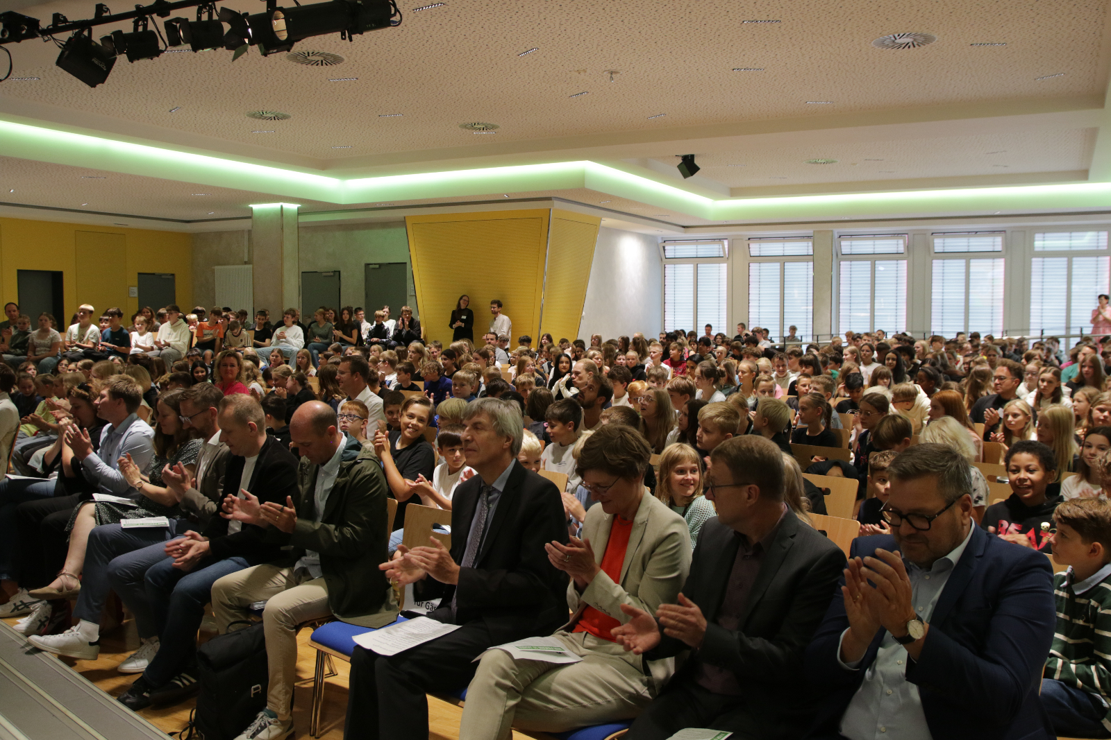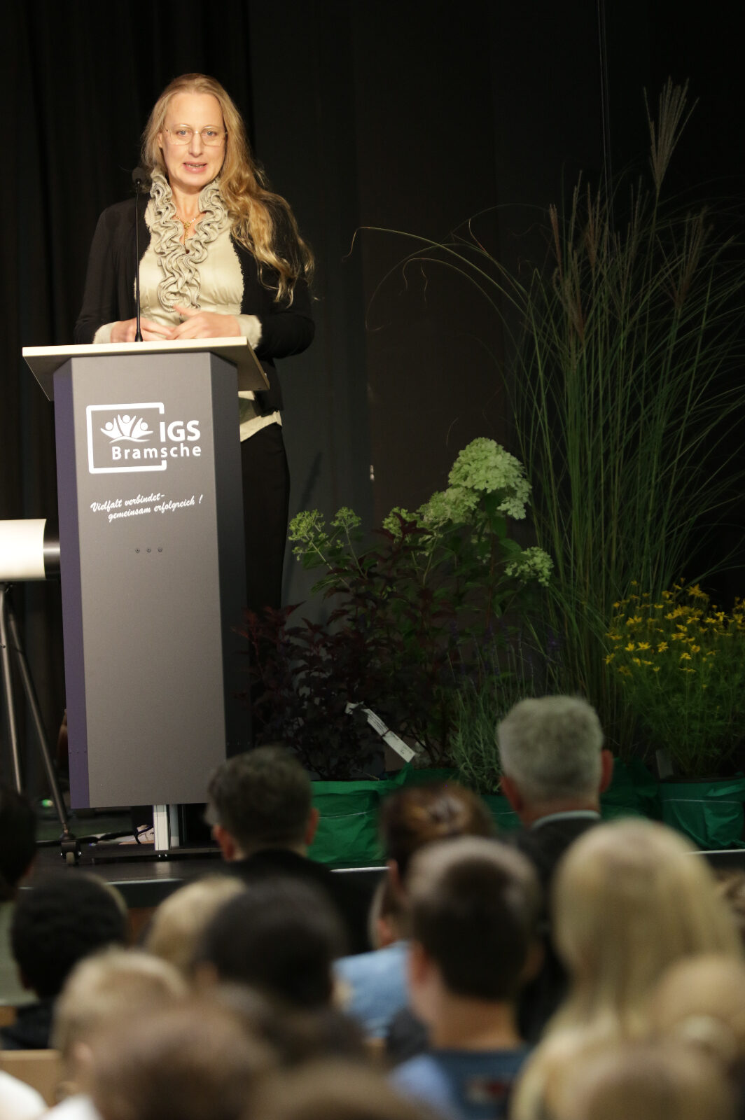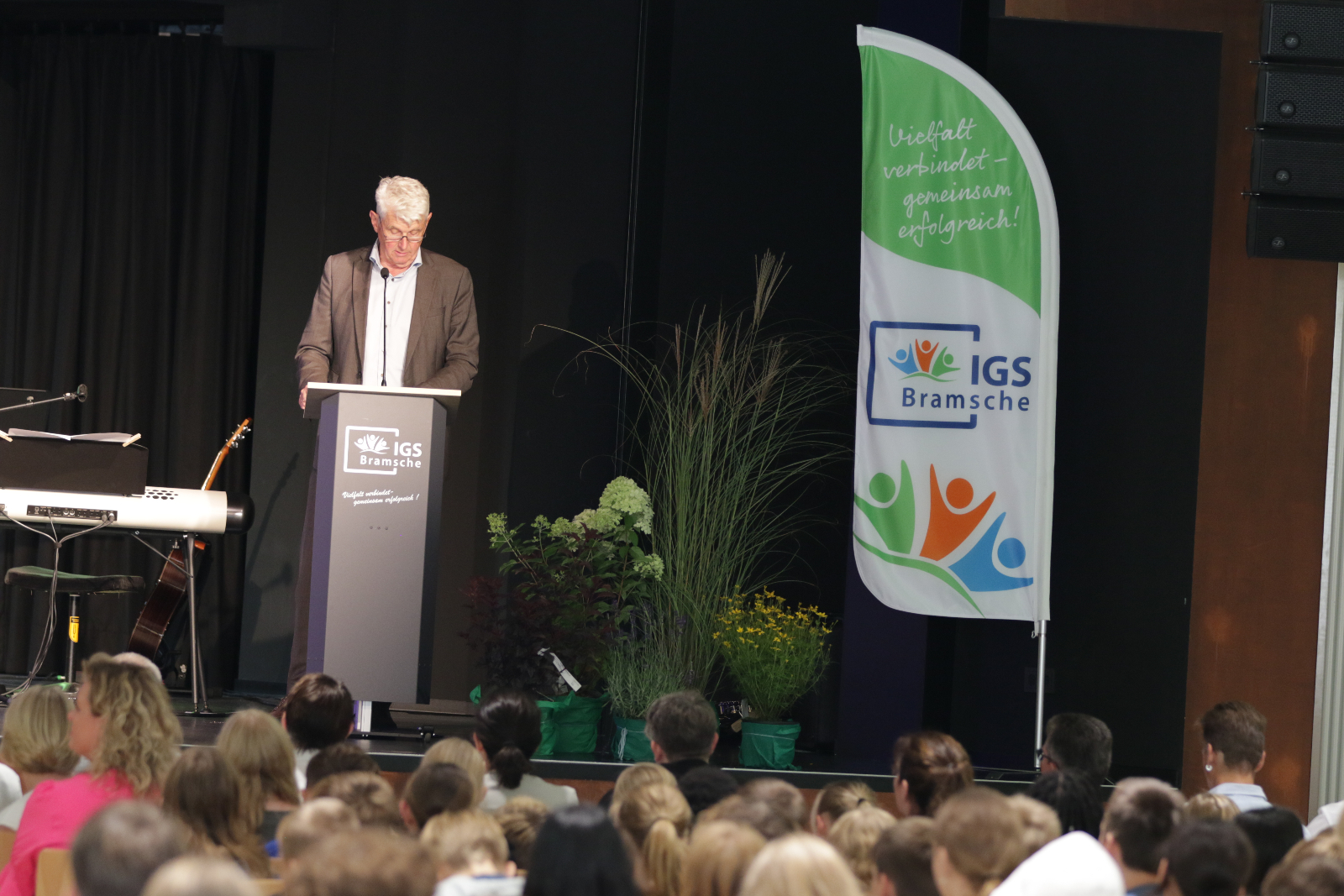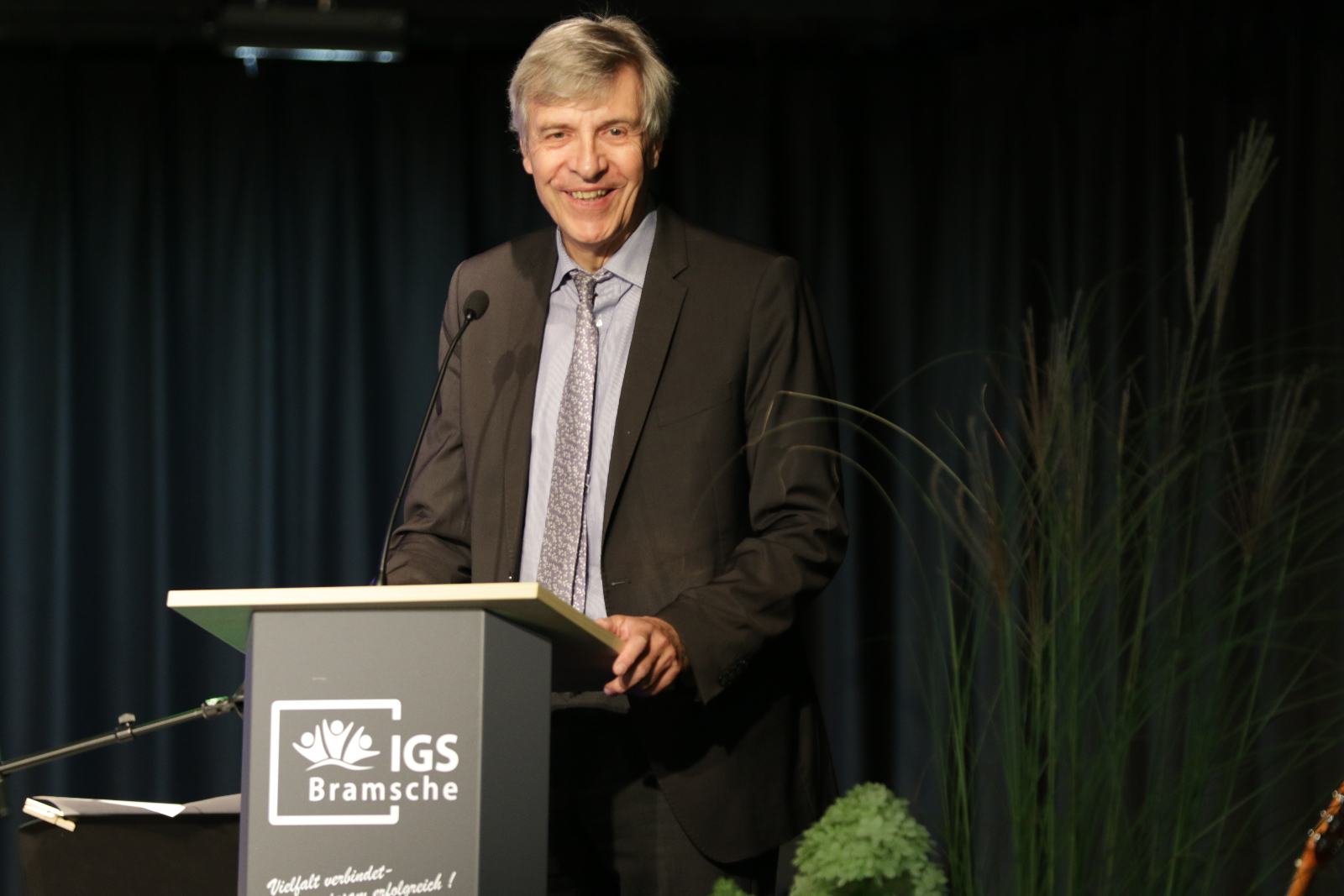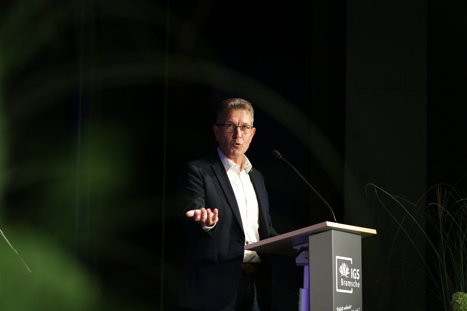 Der offizielle Festakt begann am Vormittag um 10 Uhr im Forum der Schule. Zahlreiche Gäste aus Politik und Gesellschaft, darunter Landrätin Anna Kebschull, Bramsches Bürgermeister Heiner Pahlmann, Vertreter des Regionalen Landesamtes für Schule und Bildung sowie die Politikerinnen Filiz Polat (Grüne) und VertreterInnen von Kreistagsfraktionen, überbrachten ihre Glückwünsche. Kebschull betonte in ihrer Rede: „Der Landkreis ist stolz, die IGS Bramsche als innovative Schule als Teil seiner Schullandschaft bezeichnen zu können.“ Polat verband die IGS besonders mit dem Wert der „Mitmenschlichkeit“ und wünschte der Schule in Zukunft auch endlich die zugehörige Oberstufe. Musikalisch umrahmt wurde der Festakt durch abwechslungsreiche Beiträge der schuleigenen Band, die auch von Gästen wie VfL-Ikone Joe Enochs begeistert aufgenommen wurden.
